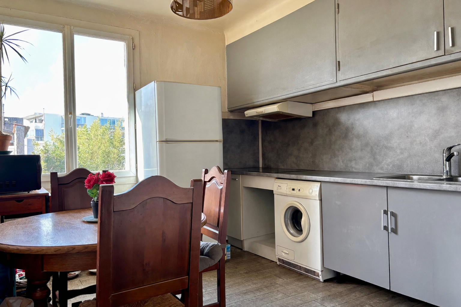 L’appartement, qui bénéficie d’une belle luminosité grâce à son exposition Sud/Ouest, se compose d’un hall d’entrée desservant une cuisine équipée ouverte sur le séjour, créant un espace de vie convivial et lumineux.